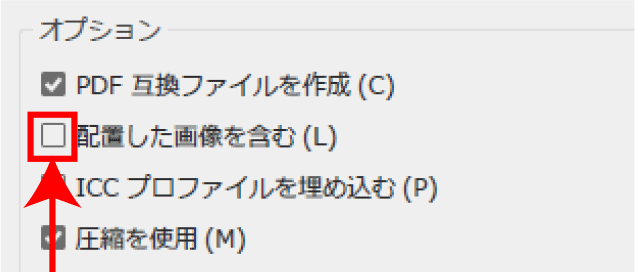Illustratorデータを保存する時に、保存オプション[配置した画像を含む]にチェックを入れると全ての画像が埋め込まれますが、トラブルの要因になりますのでチェックは入れないでください。